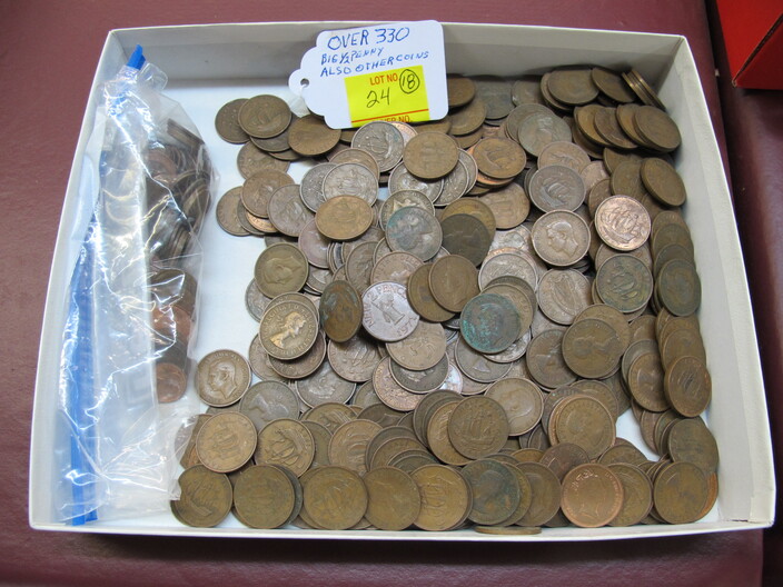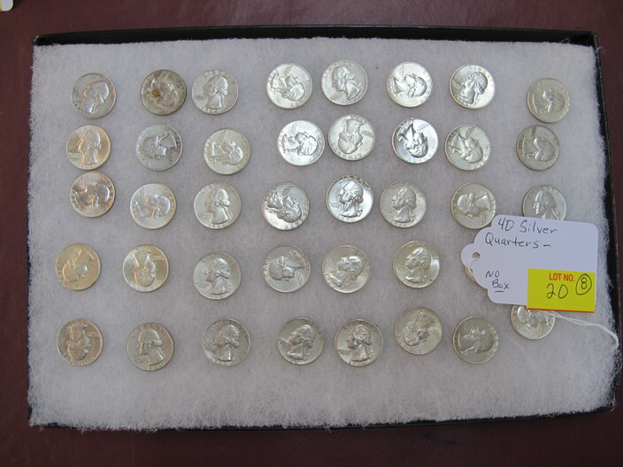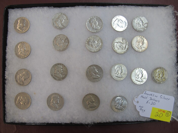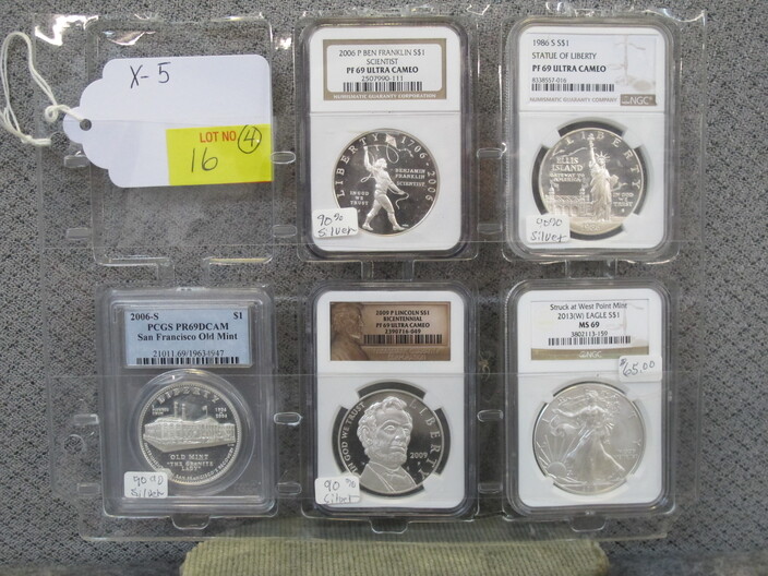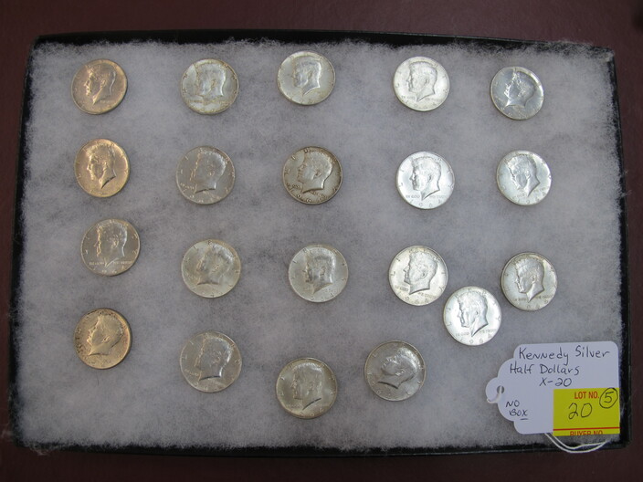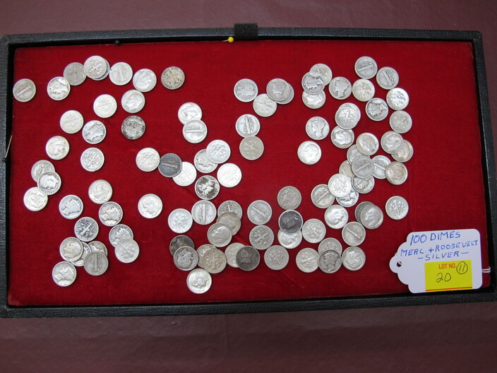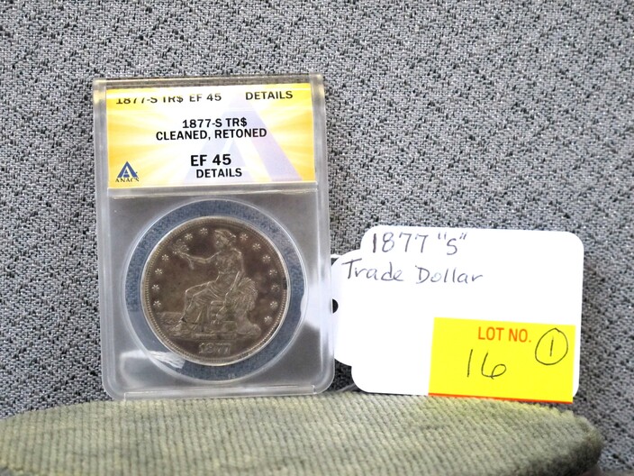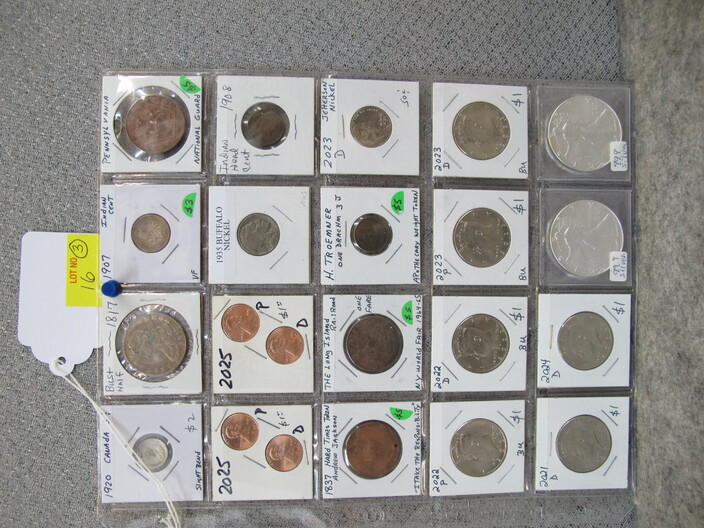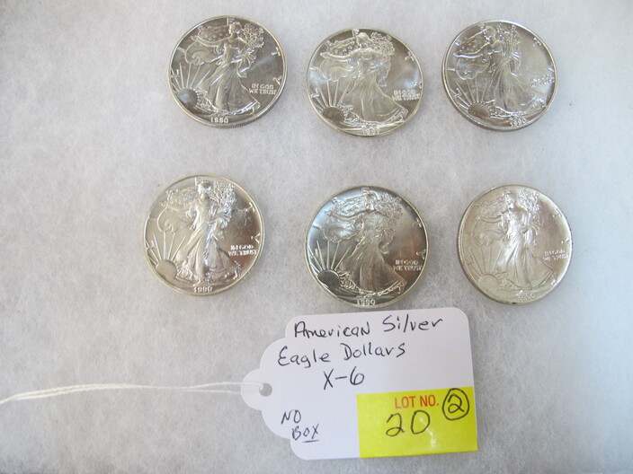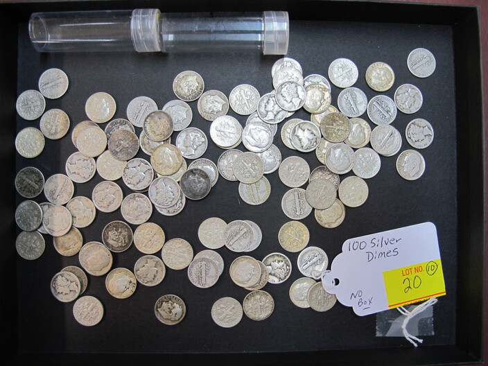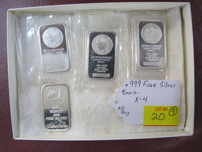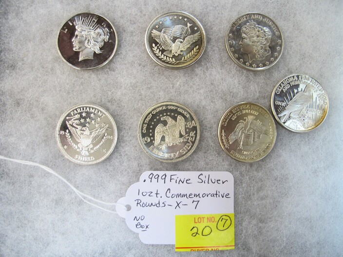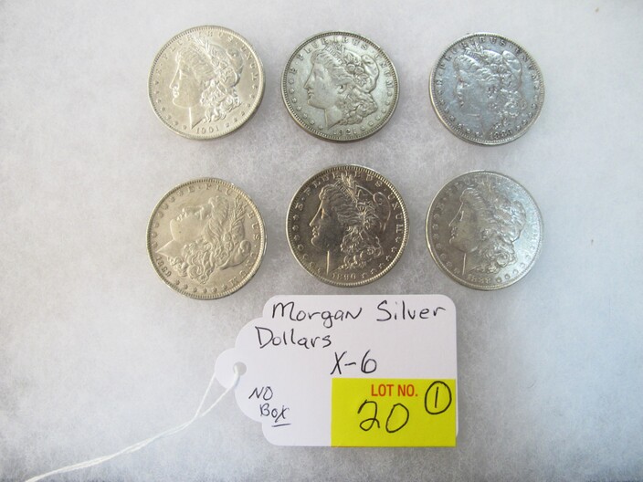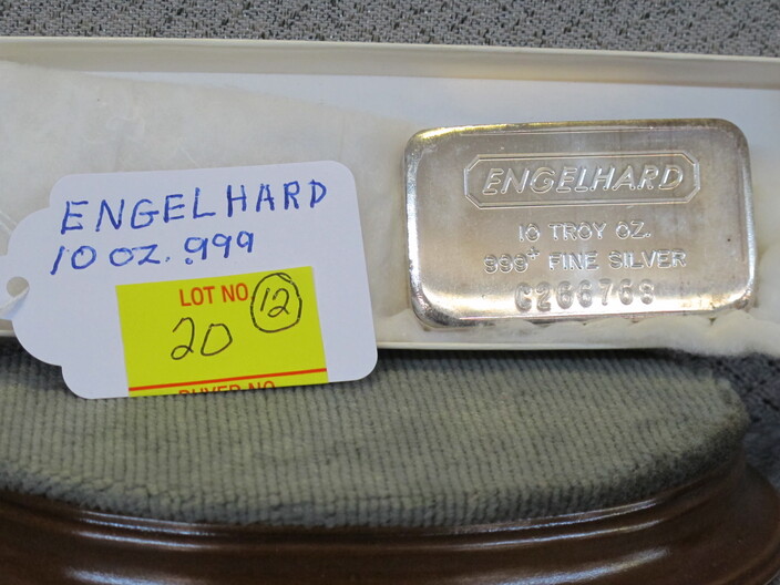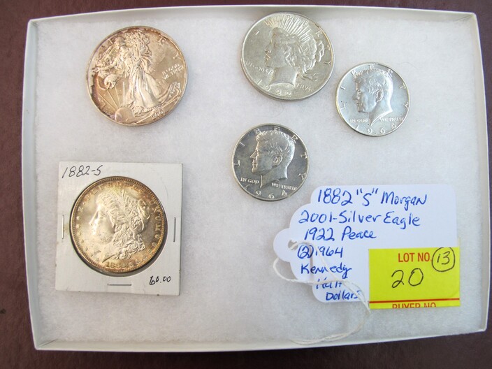 COINS & SILVER BULLION: 1877 “S” Trade Dollar~1877 Bust Half Dollar~1867 Shield Nickle~1883 Shield Nickle~1903 Indian Head Penny~Misc. Silver Coin Lot To Include: 1882 “S” Morgan Silver Dollar, 1922 Peace Silver Dollar, 2001 American Silver Eagle & (2) 1964 Kennedy Half Dollars~Morgan Silver Dollars~Franklin, Walking Liberty & Kennedy Silver Half Dollars~Wahington Silver Quarters~Silver Dimes~10 ozt. .999 Fine Silver Bar By Engelhard~.999 Silver Bars~American Silver Eagles~Misc. .999 Silver Commemorative Rounds~Over (300) Antique Large English Half Pennies~