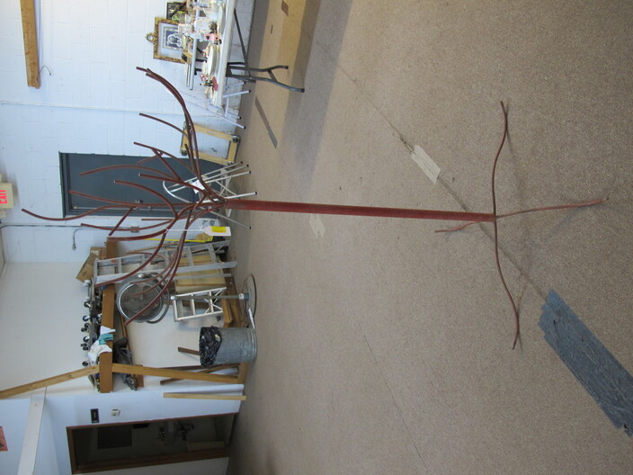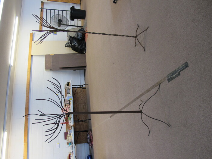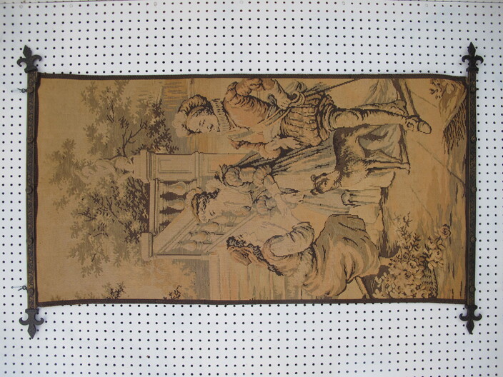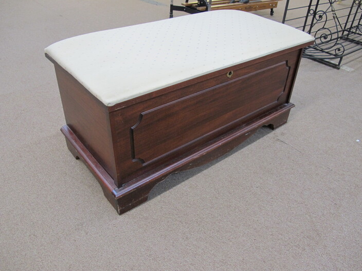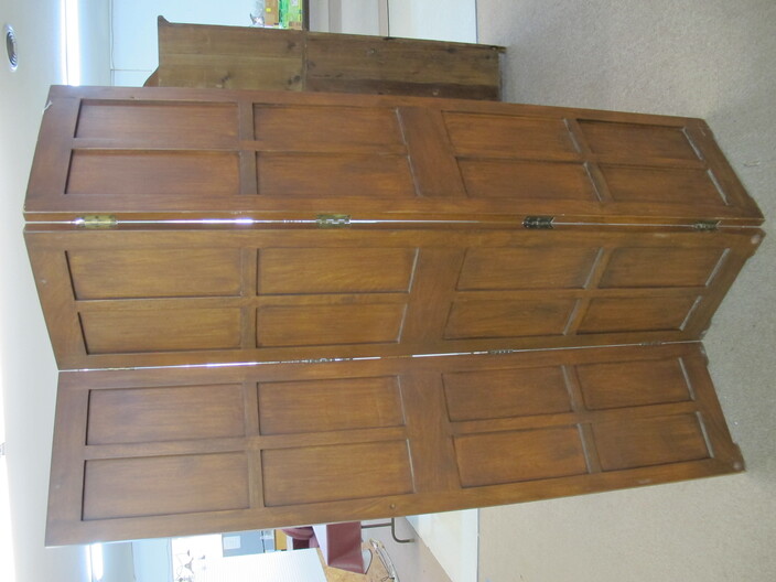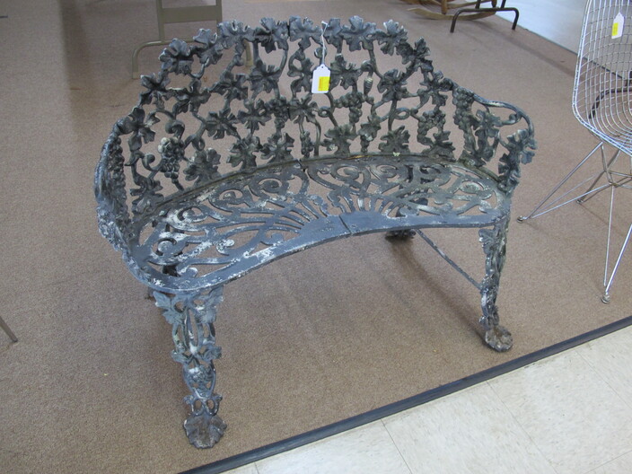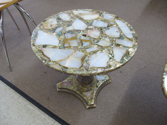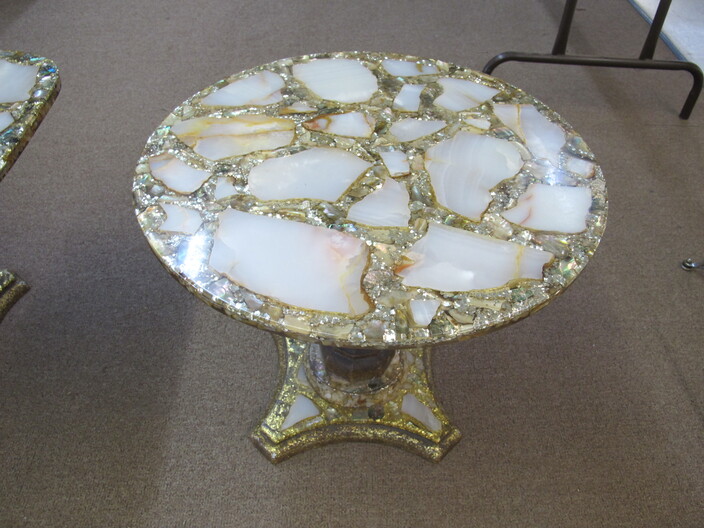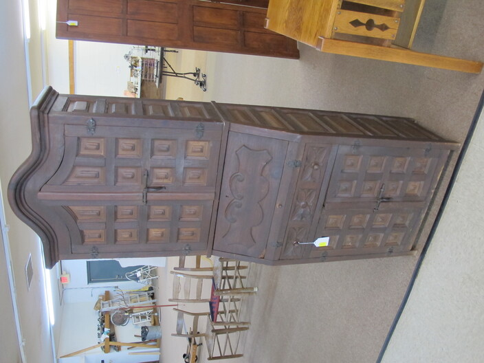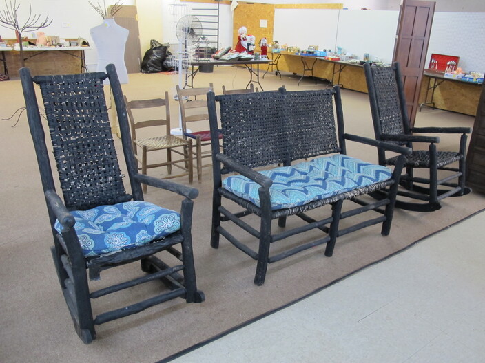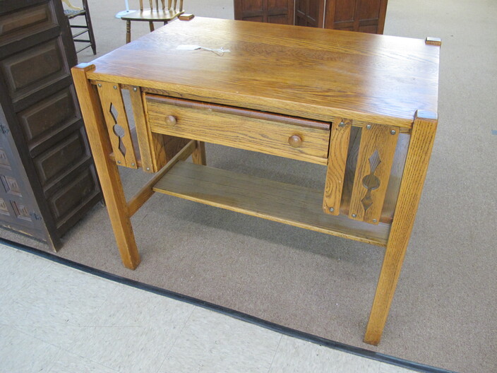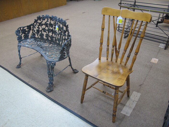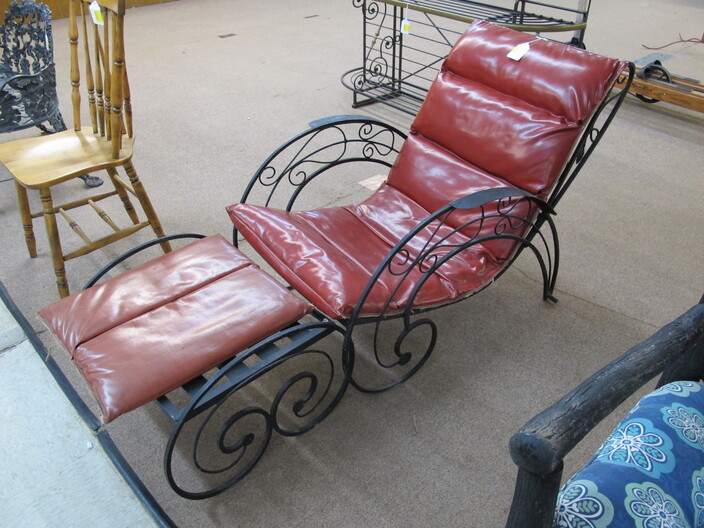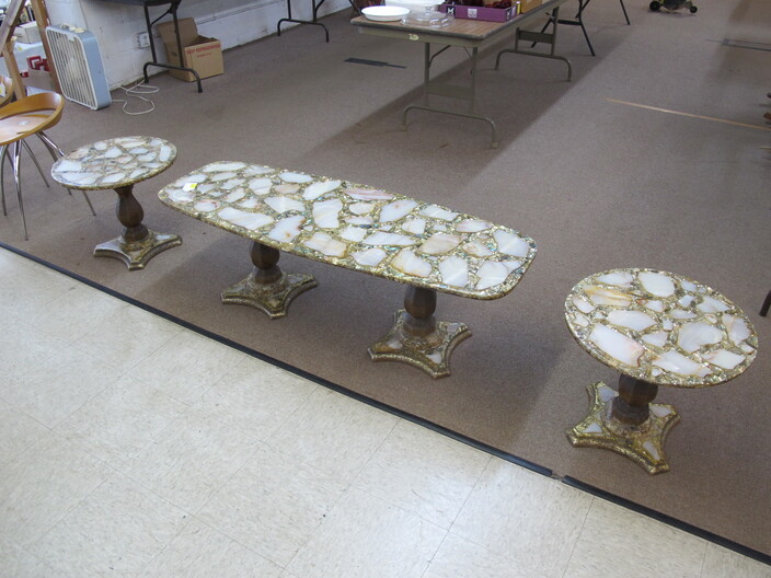 FURNITURE: Oak Arts & Crafts Era Desk w/ Pull Out Writing Tray~Small Secretary Desk, Handmade Spanish Cedar, Wrought Iron Hardware~Abalone Onyx & Gold Glitter (3) Piece Arturo Pani Coffee Table & End Tables Set~(4) Mace Country Chairs~Late 1800’s Oak Rocker~Pair Of Mid-Century Modern Italian Stools By Lyra~Country Rocker~M C Modern Chrome Wire Chair~(3) Section Paneled Room Divider~Metal Frame Lounge Chair & Ottoman~Wide Metal Baker’s Rack Base~Metal Garden Or Porch Bench~(3) Pieces Of Old Hickory Style Porch Furniture (2 Rocking Chairs & Loveseat)~Cedar Blanket Chest By Murphy Furniture~