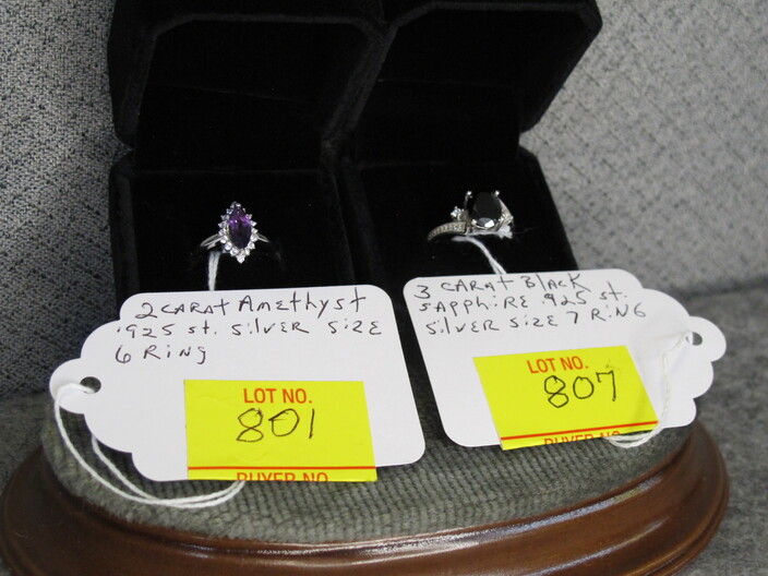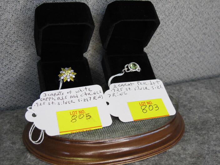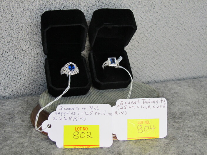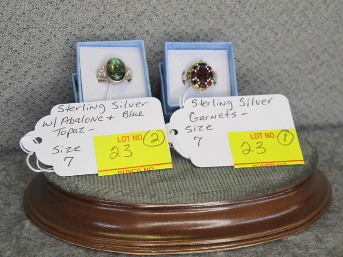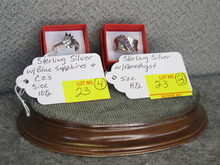 STERLING SILVER JEWELRY: Ring & (2) Carat Amethyst, Size (6) Ring~Ring w/ (3) Carats Of Blue Sapphires, Size (8)~Ring w/ (2) Carat Peridot, Size (7)~Ring w/ (2) Carat Tanzanite, Size (8)~Ring w/ (3) Carats Of White Sapphires & Citrines, Size (7)~Ring w/ (3) Carat Aquamarine, Size (8)~Ring w/ (3) Carat Black Sapphire, Size (7)~Ring w/ (3) Carats Of White Sapphires & Fire Garnets, Size (8)~Earrings w/ (4) Carats Of Rubies~Vintage Style Lady’s Ring w/ Garnets, Size (7)~Vintage Style Lady’s Ring w/ Abalone & Blue Topaz, Size (7)~Fashion Dinner Ring w/ Blue Sapphires & CZ’s, Size (10 ½)~Lady’s Wide Band Dinner Ring w/ Amethyst, Size (8 ½)~