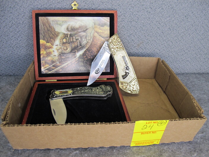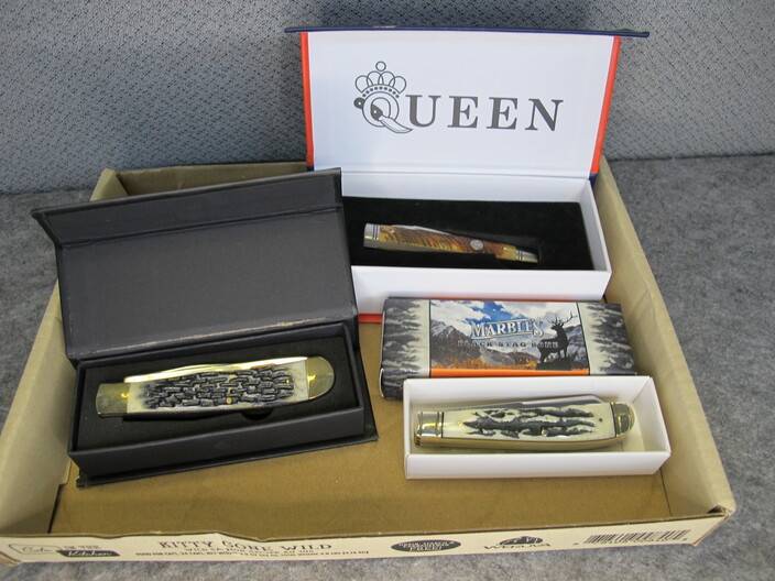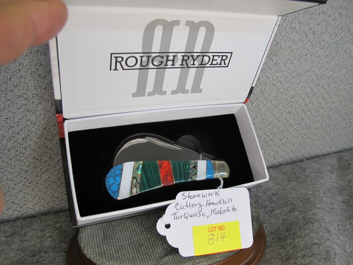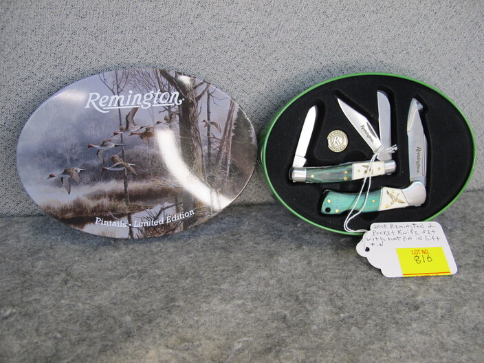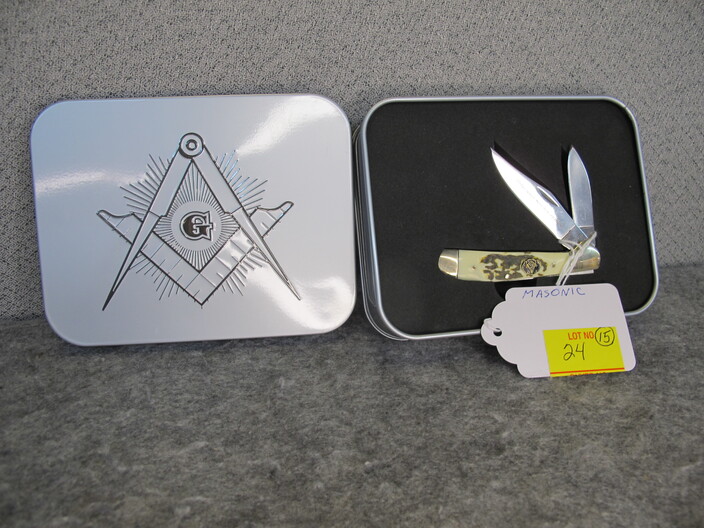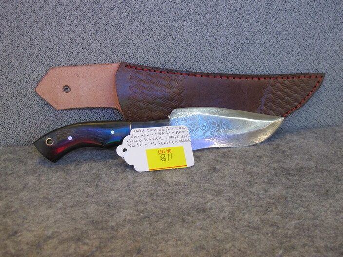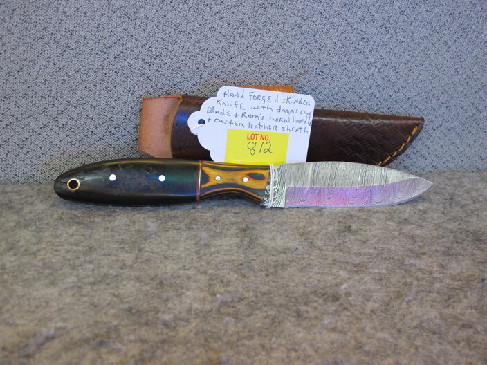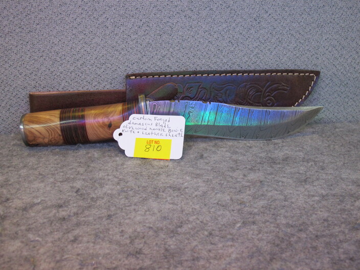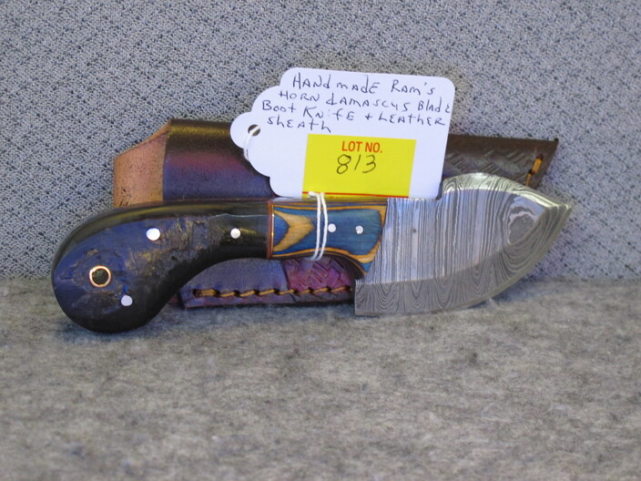 COLLECTIBLE KNIVES & RELATED: Custom Forge Damascus Blade Olive Wood Handle Bowie Knife & Custom Leath Sheath~Hand Forged Raindrop Damascus Blade Ram’s Horn Handle Large Belt Knife w/ Custom Leather Sheath~Hand Forged Damascus Blade & Ram’s Horn Handle Skinner Knife & Custom Leather Sheath~Handmade Ram’s Horn Damascus Blade Boot Knife & Custom Leather Sheath~Stoneworx Cutlery Hawkbill w/ Turquoise & Malachite Handle~Old Timer (2) Blade Trapper & Key Chain, Gift Set In Display Tin~2018 Remington (2) Pocket Knife Set w/ Hat Pin In Gift Tin~Pocket Knife w/ Masonic Emblem~Case Pocket Knife w/ Bone Handle~Other Collectible Pocket Knives~