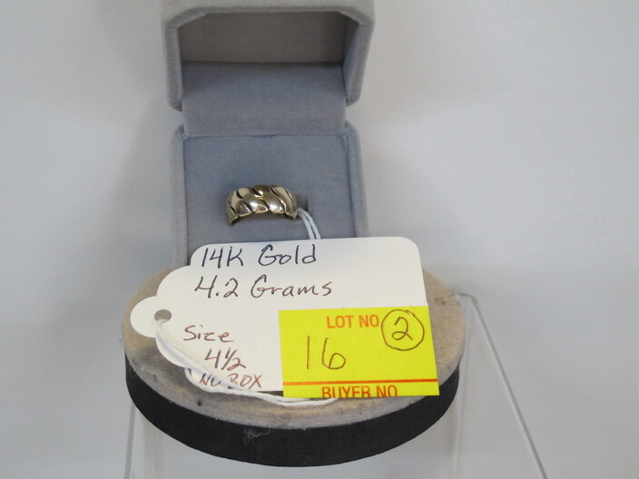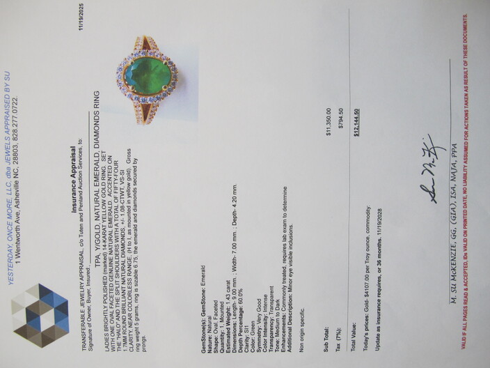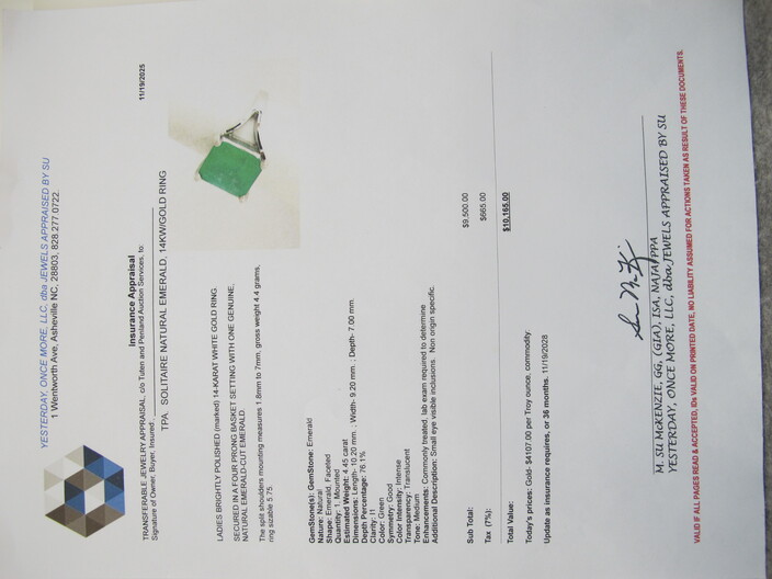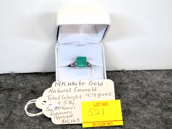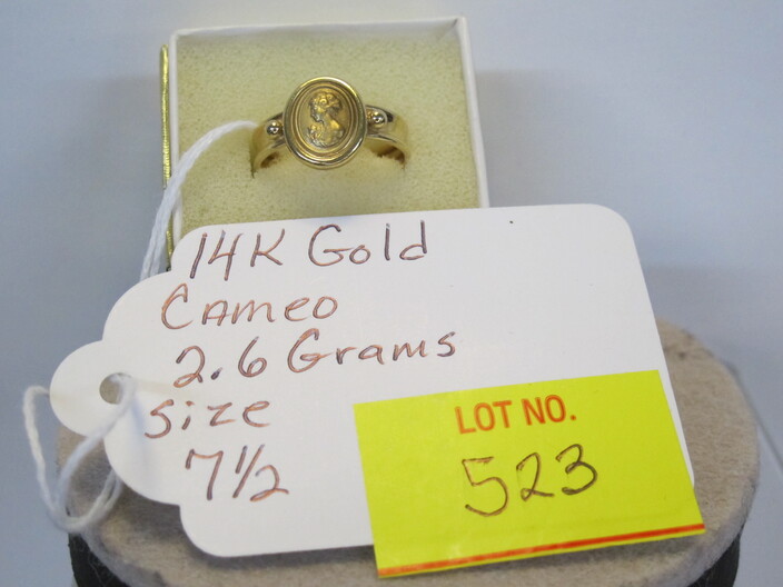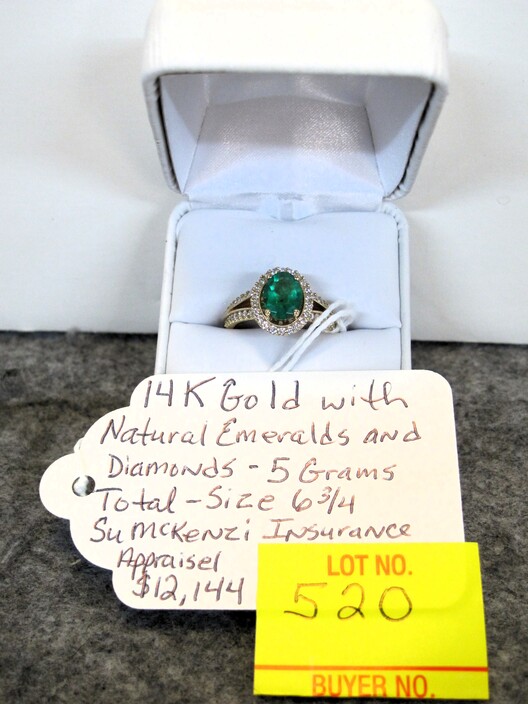 GOLD JEWELRY: 14k Gold Lady’s Dinner Ring w/ Natural Oval Emerald, Accented On The Halo & Split Shoulders w/ A Total Of (54) Round, Brilliant Natural Diamonds, (5) Grams Total Weight, Size (6 ¾ ), w/ Su McKenze Insurance Appraisal Of $12,144~14k White Gold Ring w/ Emerald Cut, Natural Emerald, Total Weight (4.4) Grams, Size (5 ¾), w/ Su McKenzie Insurance Appraisal Of $10,165~14k Gold Cameo Design Ring, (2.6 Grams), Size (7 ½)~14k Gold Band Ring w/ Design, (4.2 Grams), Size (4 ½ )~