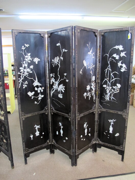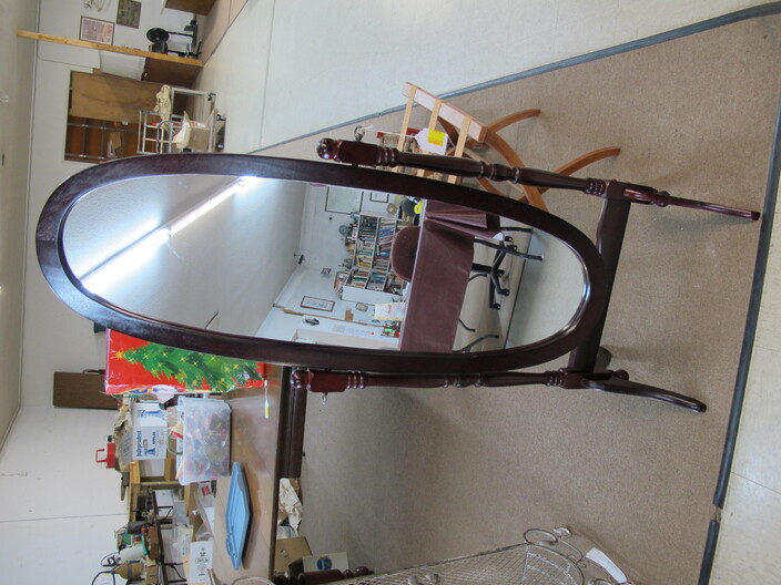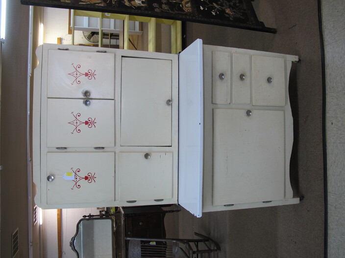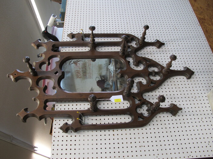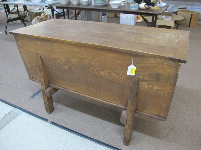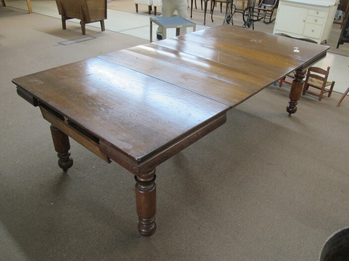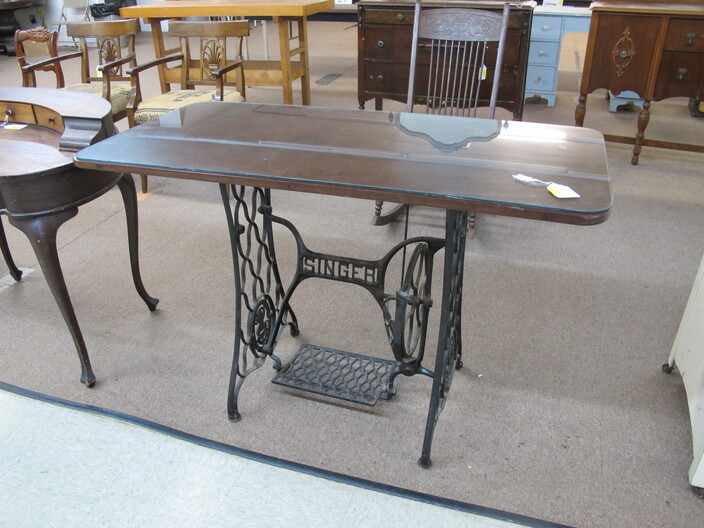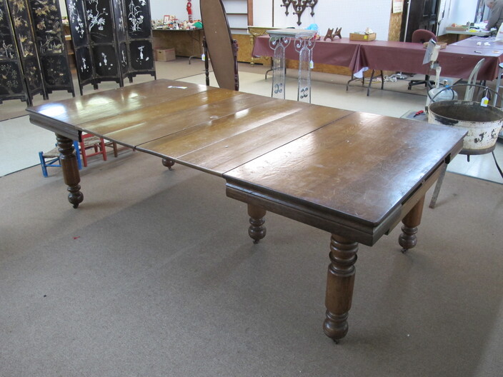 FURNITURE: Antique Oak Dining/Banquet Table w/ (4) Leaves Stored Inside~Vintage Hoosier Style Cabinet w/ Flour Sifter~Antique Vanity Table w/ Queen Anne Feet~Singer Sewing Machine Base w/ Wood & Glass Top~Vintage Server/Buffet~Antique Dresser w/ Mirror~Wooden Shop Bench~Tall (5) Shelf Bookcase~Modern Conference Table~(3) Small Doll/Child’s Chairs w/ Rush Seats~(2) Large (6’) Yellow Storage Shelves~(2) Modern Upholstered Side Chairs~Cheval Mirror~Ornate Victorian Mirror~(2) Ornate Folding Oriental Screens, One w/ Inlay~Ornate Entrance Hall Stand w/ Marble Top~Large Primitive Pine One Board Feed Box w/ Finished Top, Ideal For Coffee Table~Cast Iron Bench w/ Upholstered Seat~Ornate, Victorian (8) Post Hanging Hat Rack w/ Mirror~
