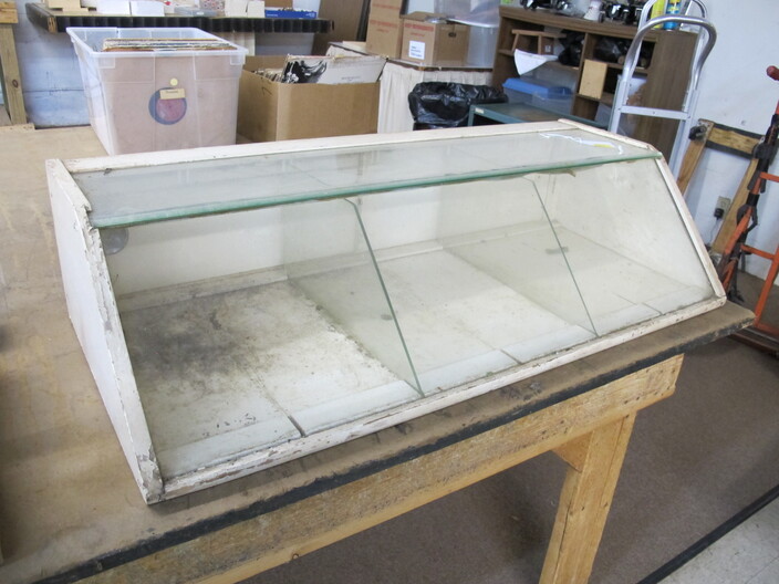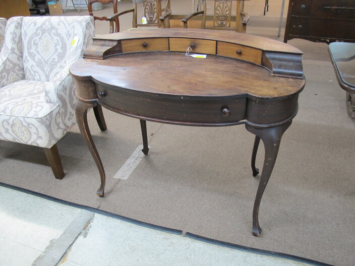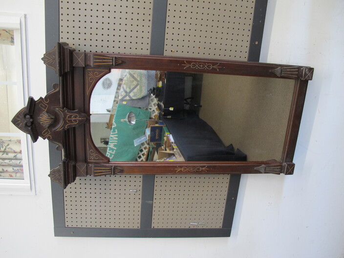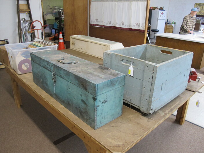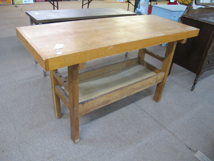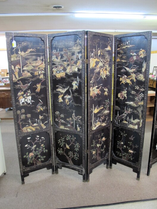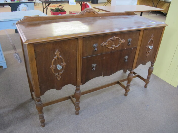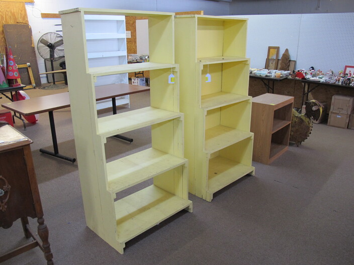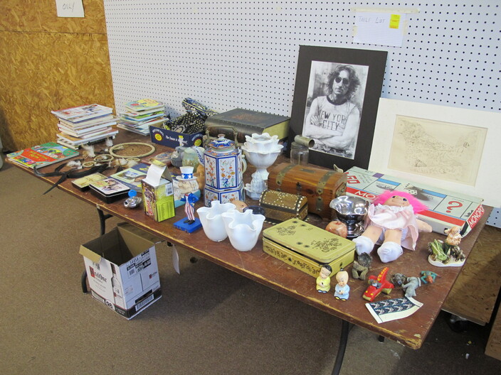 FURNITURE: Antique Oak Dining/Banquet Table w/ (4) Leaves Stored Inside~Vintage Hoosier Style Cabinet w/ Flour Sifter~Antique Vanity Table w/ Queen Anne Feet~Singer Sewing Machine Base w/ Wood & Glass Top~Vintage Server/Buffet~Antique Dresser w/ Mirror~Wooden Shop Bench~Tall (5) Shelf Bookcase~Modern Conference Table~(3) Small Doll/Child’s Chairs w/ Rush Seats~(2) Large (6’) Yellow Storage Shelves~(2) Modern Upholstered Side Chairs~Cheval Mirror~Ornate Victorian Mirror~(2) Ornate Folding Oriental Screens, One w/ Inlay~Ornate Entrance Hall Stand w/ Marble Top~Large Primitive Pine One Board Feed Box w/ Finished Top, Ideal For Coffee Table~Cast Iron Bench w/ Upholstered Seat~Ornate, Victorian (8) Post Hanging Hat Rack w/ Mirror~