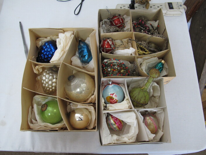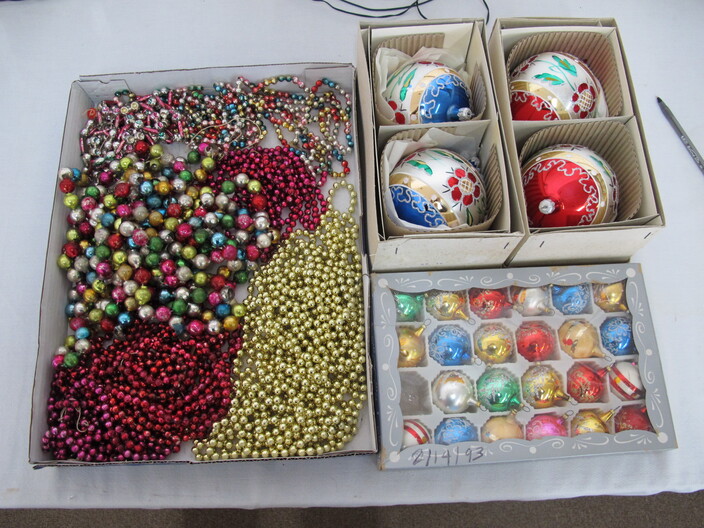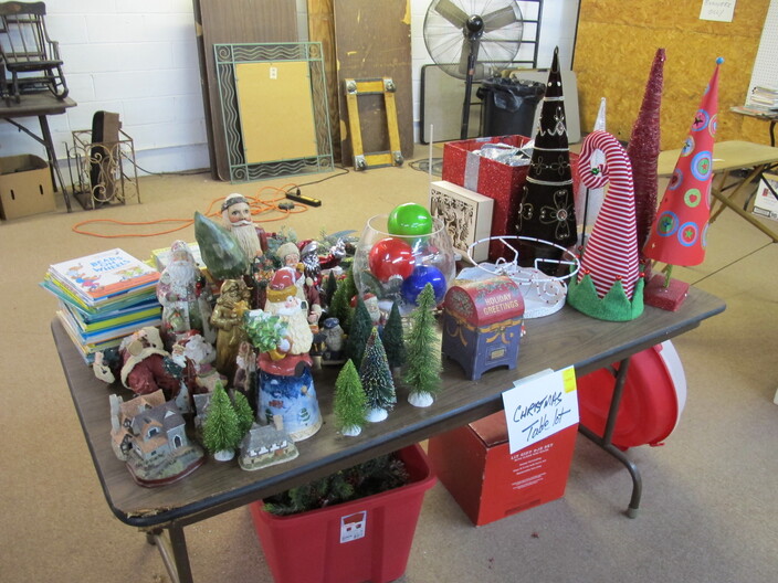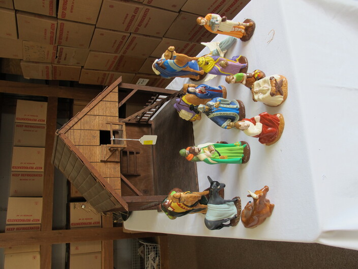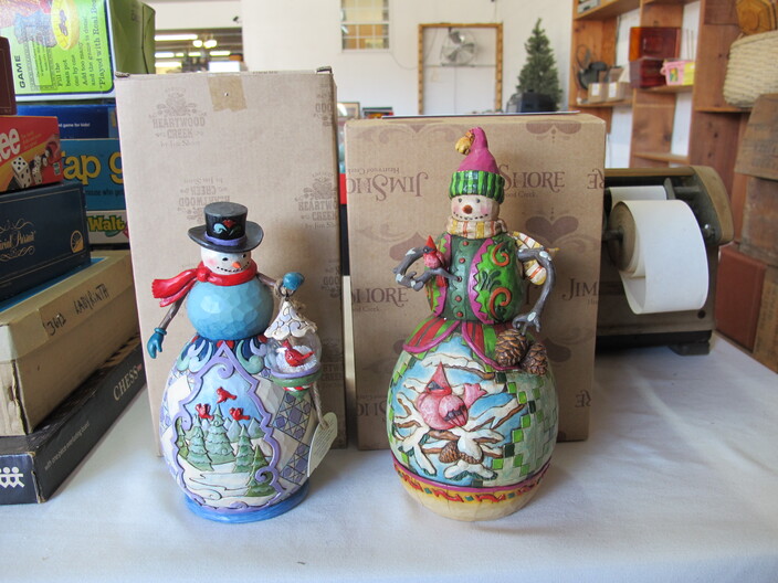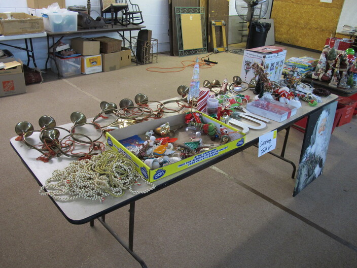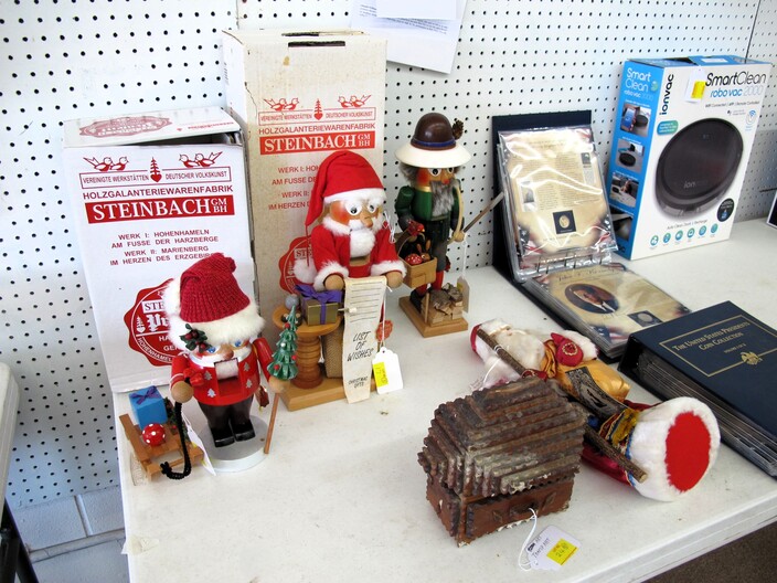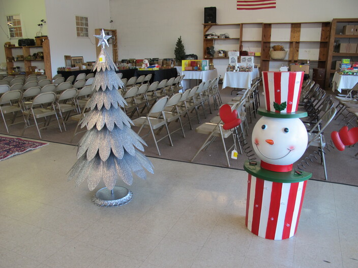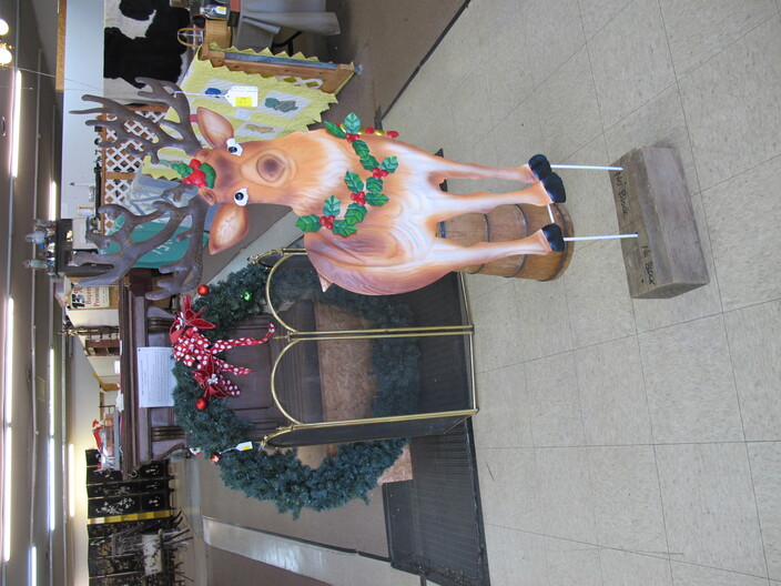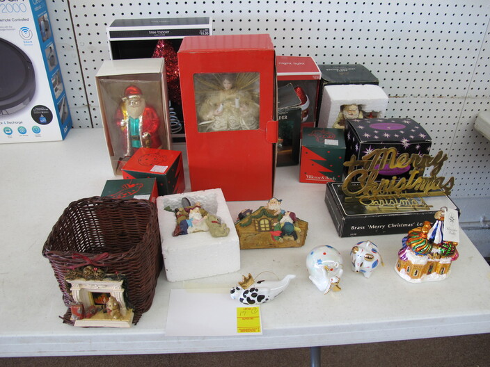 CHRISTMAS ITEMS: Lighted, Heavy Duty Indoor/Outdoor Snowman w/ Waving Arms~Emryn House (5’) Tall Galvanized Iron Holiday Tree~Large Metal Indoor/Outdoor “Christmas Bear” Sign~Big Metal Holiday Reindeer Yard Art~Lighted Christmas Tree~Christmas Music, Lighted Carousel w/ Moving Horses~Russian Santa w/ Original Tags, Bought In Russia Over (30) Years Ago~(2) Steinbach Santa Nutcrackers w/ Original Boxes~(4’) Lighted Christmas Wreath~Dept. 56 Lighted Village~(11) Avon Christmas Plates 1984-1995 (Missing 1994)~Manger w/ Ceramic Figures~Jim Shore Lot To Include (2) Items, Snowman w/ Cardinal “Red On Snowy White”, & Snowman w/ Glass Globe “Winter’s Beauty”~Christmas Tree Metal Table Centerpiece Candle Holder & Hallmark Boxed Santa w/ Staff & Box Of Knitted Ornaments~(4) Lots Of Antique Christmas Ornaments~Set Of 12 Days Of Christmas Glasses~Collectible Elf Figures~Several Table Lots Of Misc. Collectible, Christmas Related Décor, Some w/ Wear~