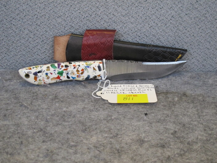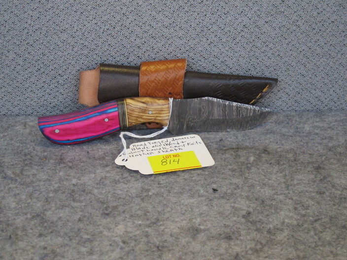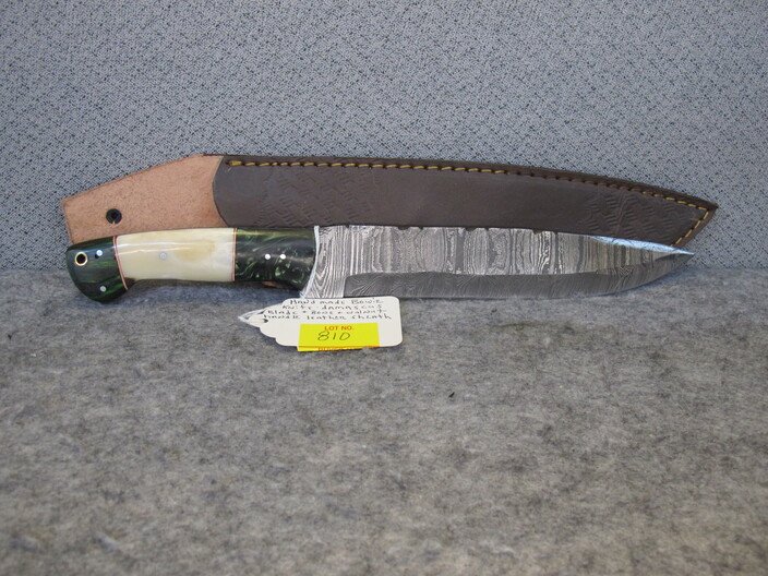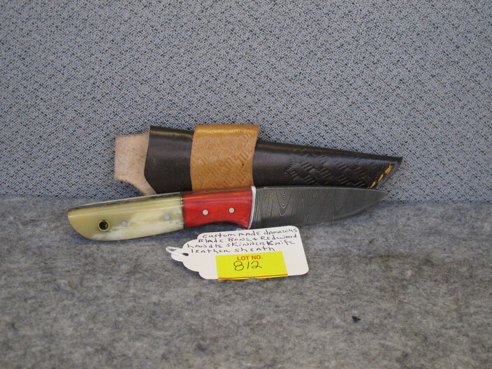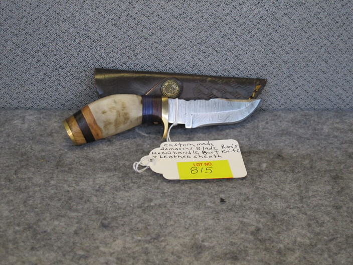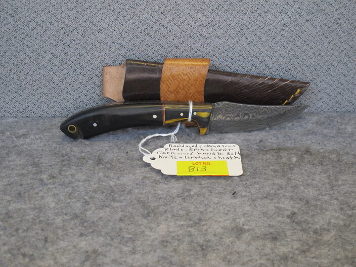 COLLECTIBLE KNIVES & RELATED: Handmade Bowie Knife w/ Damascus Blade & Bone, Walnut & Sandstone Handle & Custom Leather Sheath~Hand Forged Skinner Knife w/ Damascus Blade & Corian Sandstone Handle & Custom Leather Sheath~Custom Made Damascus Blade, Bone & Redwood Handle Skinner Knife w/ Leather Sheath~Handmade Damascus Blade, Ram’s Horn & Tiger Wood Handle Belt Knife w/ Leather Sheath~Hand Forged Damascus Blade Olive & Walnut Wood Handle Camp Knife & Custom Leather Sheath~Custom Made Damascus Blade Ram’s Horn Handle Boot Knife w/ Custom Leather Sheath~(2) Swords, (1) w/ Horsehead Scabbard~