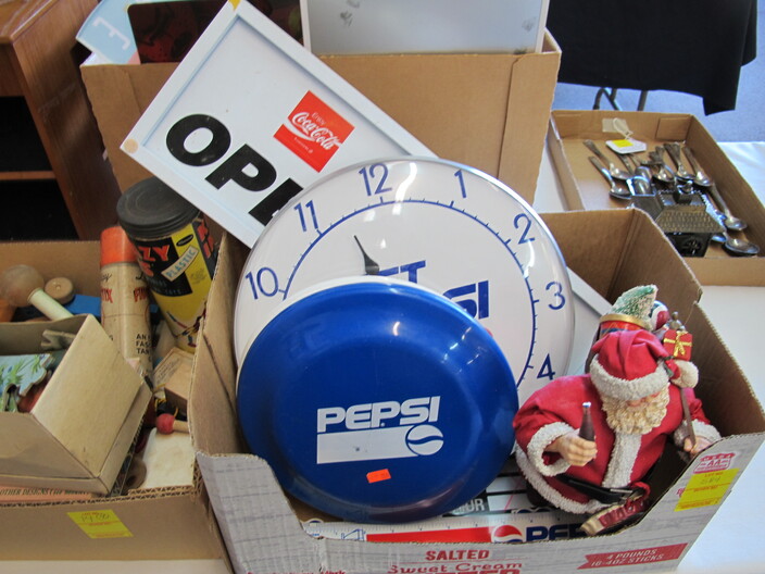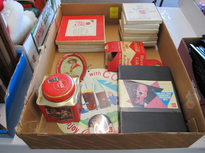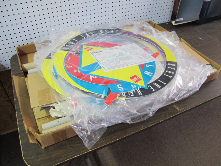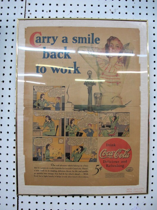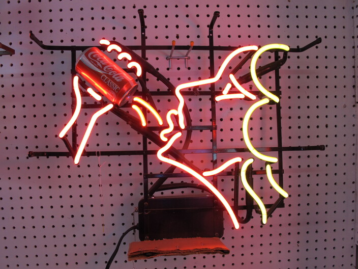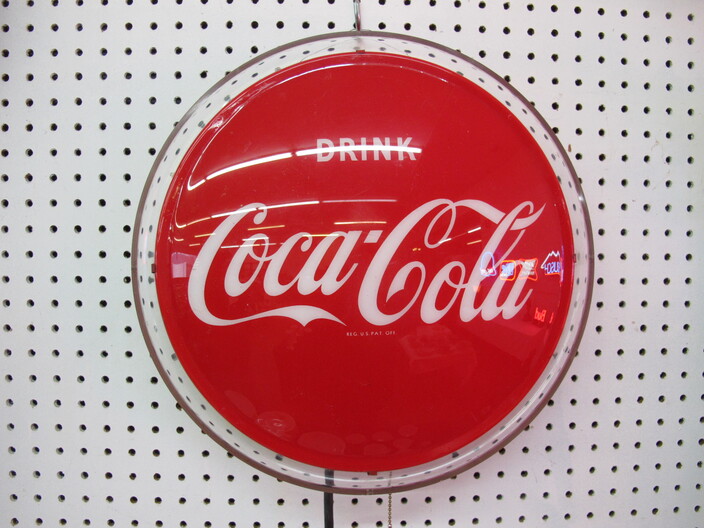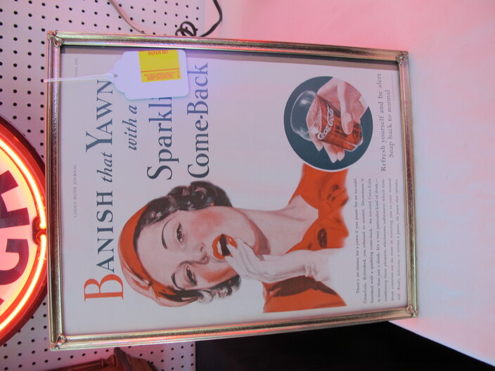 ADVERTISING COLLECTION: Vintage Coca Cola “Take Some Home” Rotating Lamp~(8) Neon Signs Including: Coca Cola, Miller Time, Busch, Miller High Life, Budweiser, Bud Lite “Lady Luck”, Miller Lite, Bud Light Clock~“Entertain Your Thirst” 1942 Ad w/ Damage~Vintage Drink Coca Cola (6) Bottle Metal Carton Display Stand~1885 Reproduction Oak Dr. Pepper Wall Clock~Falls City Beer Sign “Majors In Good Taste”~1934 Herald Examiner Coca Cola Ad~Reproduction 1896 Coca Cola Baird Clock~Small Reproduction Coca Cola Regulator Clock~(2) Centennial Celebration Coca Cola Limited Edition Pin Set~Coca Cola Salutes Walt Disney World, Happy 15th Birthday Pin Set~(2) “Coke Adds Life To Everything Everything Nice” Corkboards~(2) Miller Genuine Draft Metal Signs~“Happy Birthday Bugs Bunny” Sign (1940-1990)~Coca Cola Founders Mirrors~(2) Vintage Tom’s Toasted Peanuts Display Cabinets~Reproduction Oak Pepsi Cola Wall Clock~Bud Light Up Sign~Coca Cola Cast Iron Sign Base (Base Only)~“Beat The Heat” Coca Cola Display In Box~Coca Cola Syrup Dispenser Front~Framed Raquel Welch New Look Of Coke Ad~Diet Pepsi “You Got The Right One Baby” Ad w/ Ray Charles~Porcelain Columbia Records Reproduction Sign~Uncut Sheet Of Coca Cola Card, 1994~1950’s “Drink Coca Cola” (16”) Neon Sign, Not Working~Misc. Coca Cola Collectibles~