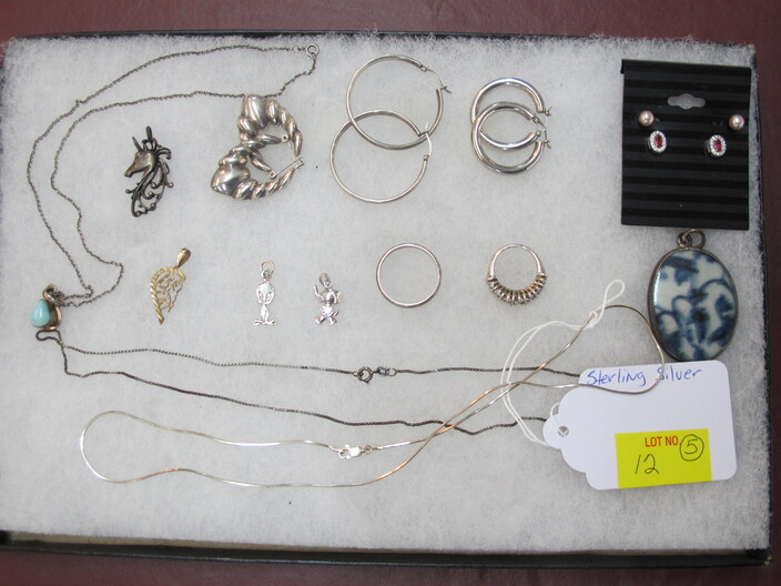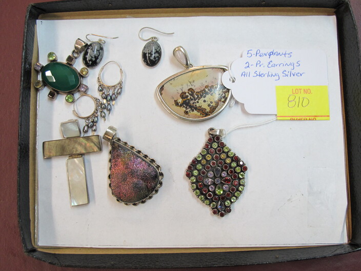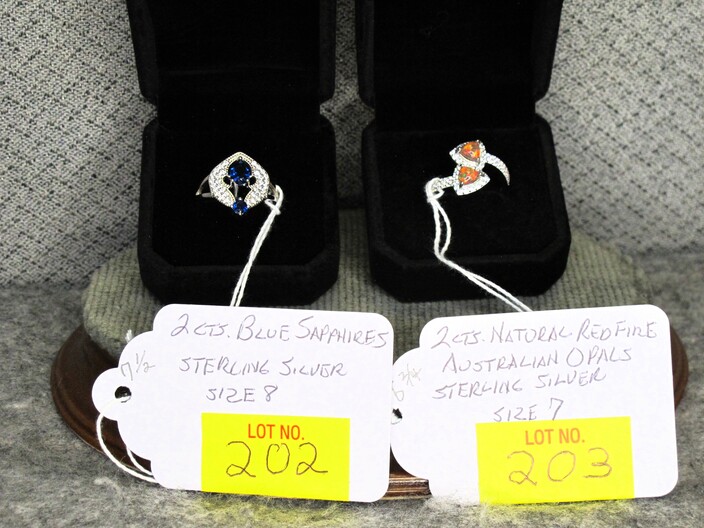 STERLING SILVER JEWELRY: Ring w/ (3) Carat Ruby, Size (7)~Ring w/ (2) Carats Of Blue Sapphires, Size (8)~Ring w/ (2) Carats Of Natural Red Fire Australian Opals, Size (7)~Turkish Made Bracelet w/ (10) Carats Of Emeralds & Rubies~Bracelet & Necklace w/ Carnelian Stones~Lot w/ (5) Pendants & (2) Pairs Of Earrings w/ Misc. Gemstones~Wedgwood Cameo Necklace~Lot w/ (3) Piece Tahitian Pearl Set (Earrings & Necklace) & Necklace w/ Cultured Pearl~(5) Sterling Silver Rings w/ Velvet Display~Chain Necklace, Hollow (26 Grams)~Spiral Ring, Size (5)~Agate Ring w/ DNZ, Size (7)~Dinner Ring w/ CZ’s By DK, Size (7 ½ )~Lot w/ Misc. Earrings & Necklaces~