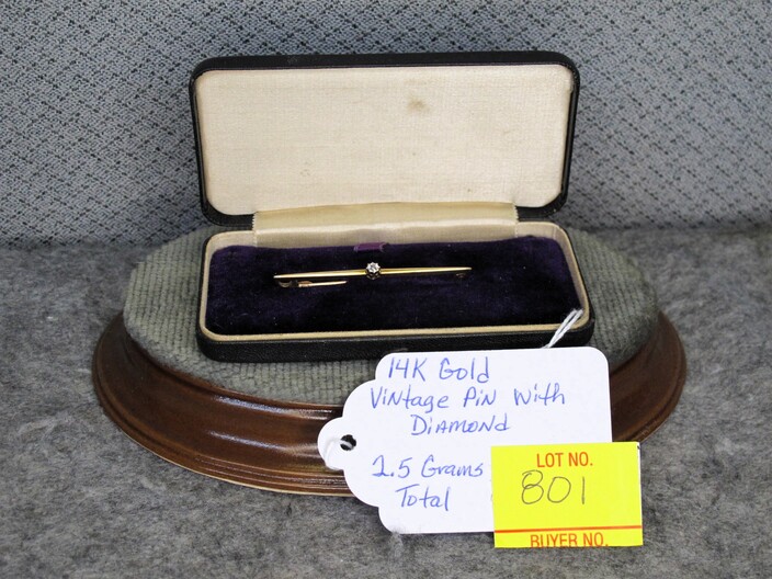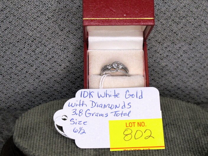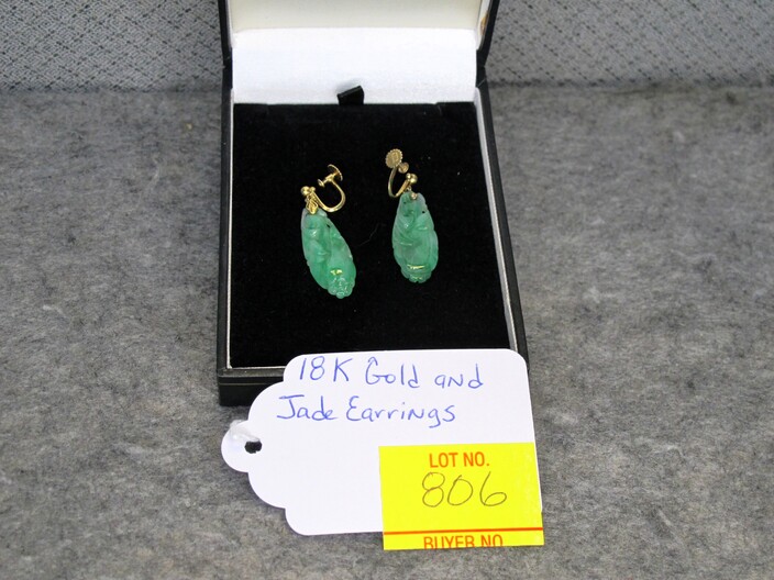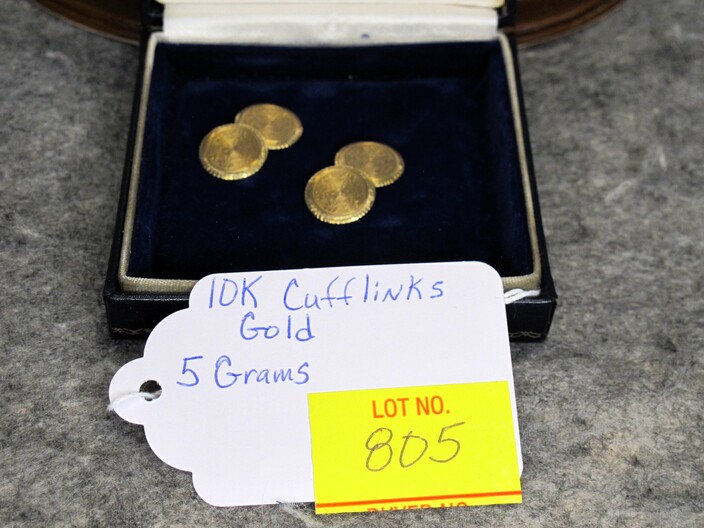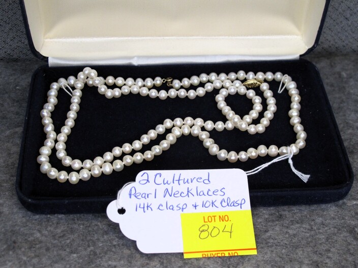 GOLD JEWELRY: 14k Gold Vintage Pin w/ Diamond, (2.5 Grams Total)~10k White Gold Cocktail Ring w/ Diamonds, Size (6 ½ ), (3.8 Grams Total)~10k Gold Child’s Band Type Ring (.4 Grams Total)~10k Gold Victorian Era Cuff Links (5 Grams Total)~(2) Cultured Pearl Necklaces w/ 14k & 10k Clasps~Pair Of 18k Gold & Jade Earrings~