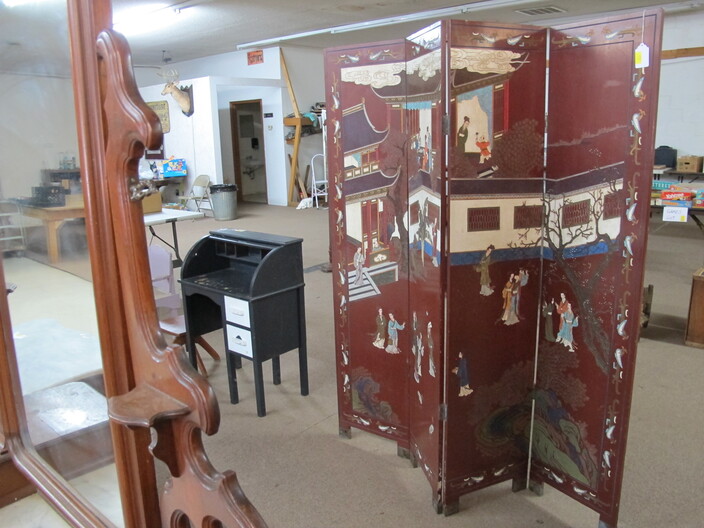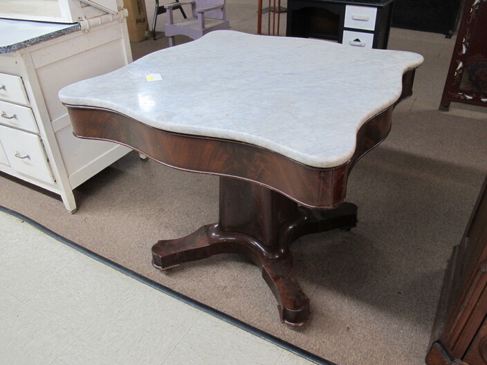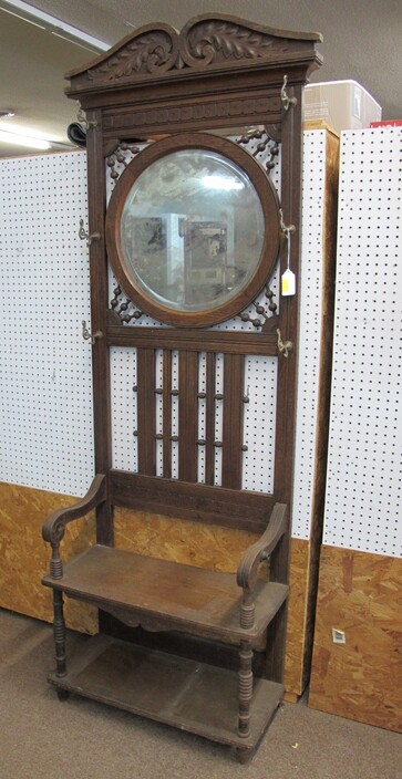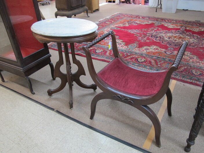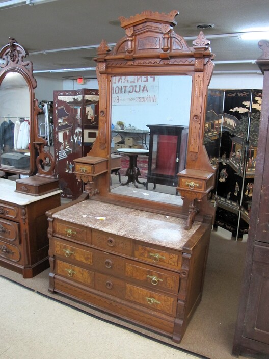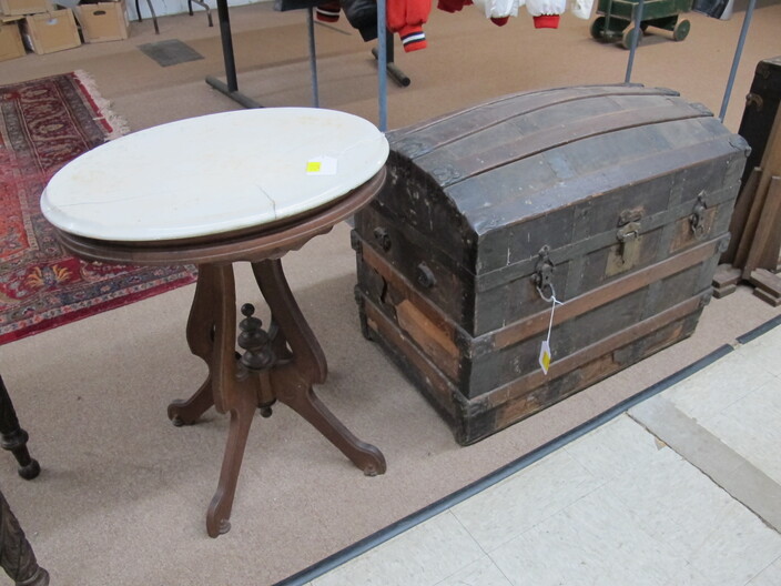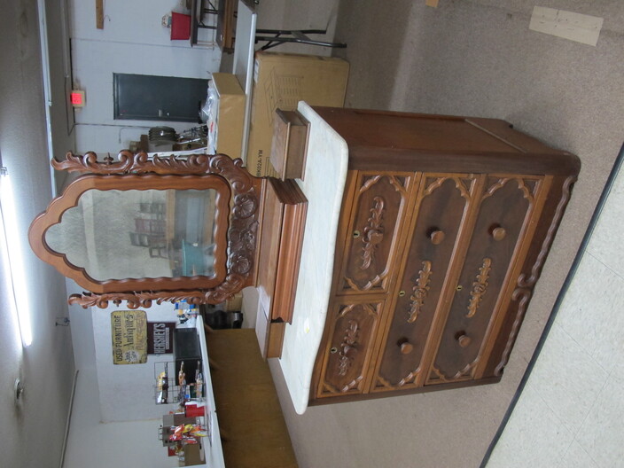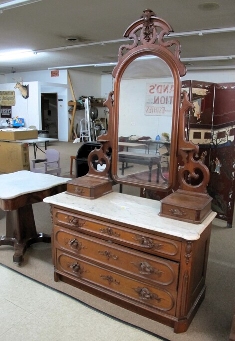 FURNITURE: Art Deco Nightstand~Early 1900’s Country Cabinet~Victorian (3) Drawer Dresser w/ Hand Carved Bell & Flowers Pulls~Antique Empire Table w/ (35”) Scalloped Marble Top~Vintage Mcdougall Cabinet~Victorian Marble Top Dresser w/ Carved Flower Mirror Frame & Door Pulls~Antique English Edwardian Game Table~Sturdy Handcrafted Twig Table~Ornate Eastlake Hall Tree~Antique Oak Washstand w/ Splash Back~Very Ornate Victorian Marble Top Dresser (Crack In Marble) w/ Boxes On Sides Of Mirror~Vintage Display Cabinet w/ Gothic Style Glass Door~Vintage Curio Cabinet w/ Cabriole Legs~(2) Victorian Oval Marble Top Tables~Vintage Ornate Folding Luggage Stand~Child’s Roll Top Desk & Swivel Chair~(2) Vintage Ornate Oriental Screens, (1 is 6 Panel & 1 is 4 Panel)~Vintage Curule Chair w/ Red Velvet Seat~Antique Dome Top Trunk w/ Oak Straps & Metal Décor~Contemporary Coffee Table w/ Slate Insert Top~Antique Arts & Crafts Style Oak Display Pedestal~