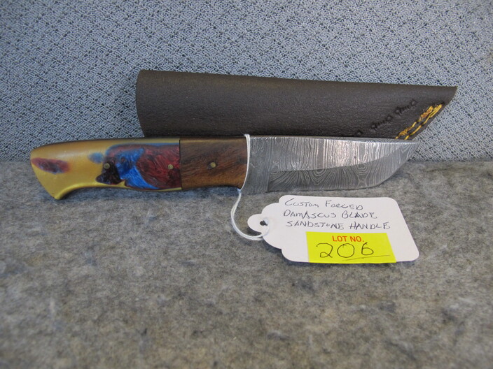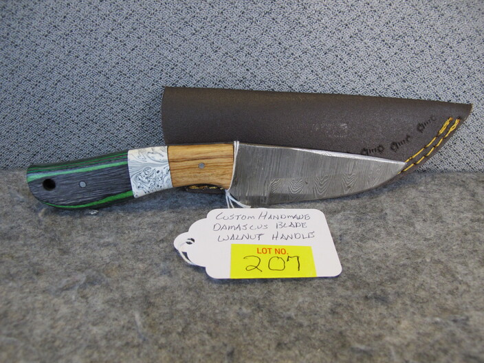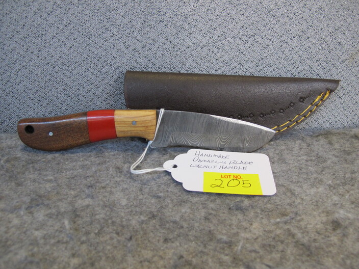 COLLECTIBLE KNIVES & RELATED: Handmade Damascus Blade Walnut Handle Skinner Knife w/ Custom Leather Sheath~Custom Forged Damascus Blade Walnut & Corian Sandstone Handle Skinner Knife w/ Custom Leather Sheath~Custom Handmade Damascus Blade Walnut Handle Skinner Knife w/ Handmade Leather Sheath~
