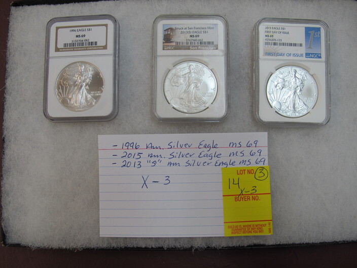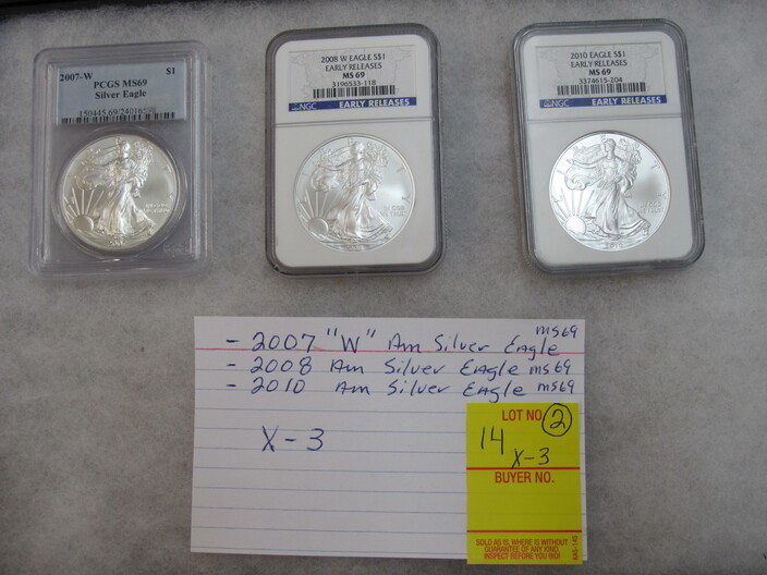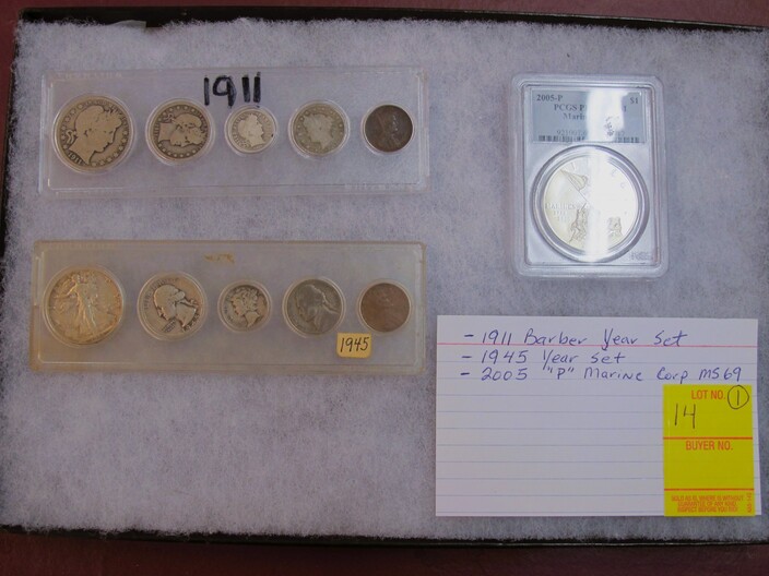 SILVER COINS & CURRENCY: (2) Lots Of (40) Silver Quarters (80 Total)~(1) Lot w/ (100) Silver Dimes~(1) Lot To Include: 1911 Barber Year Coin Set, 1945 Year Set, 2005 “P” Marine Corp Proof MS69 Silver Dollar~(1) Lot w/ Graded MS69 American Silver Eagles: 2007 “W”, 2008 & 2010~(1) Lot w/ Graded MS69 American Silver Eagles: 1996, 2015 & 2013 “S”~Confederate 1864 $50 Note~Confederate 1863 Stated Of America $500 Bond w/ All But One Coupon~
