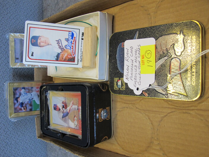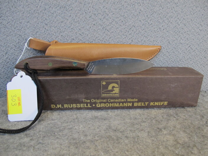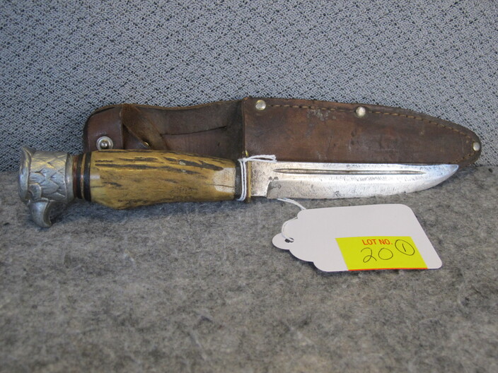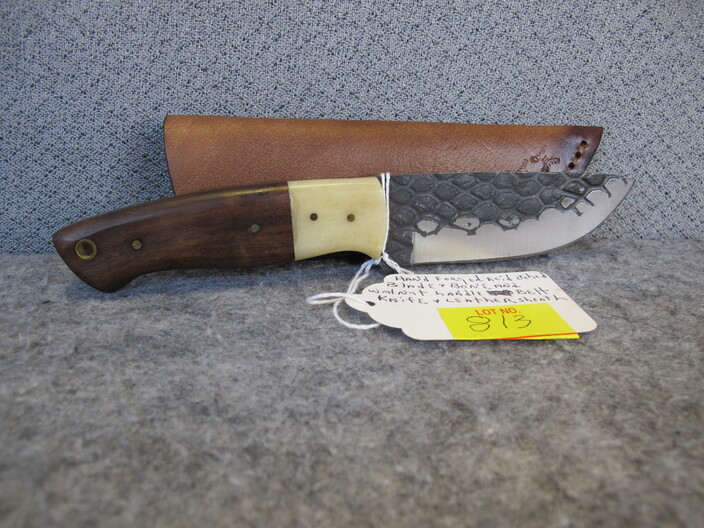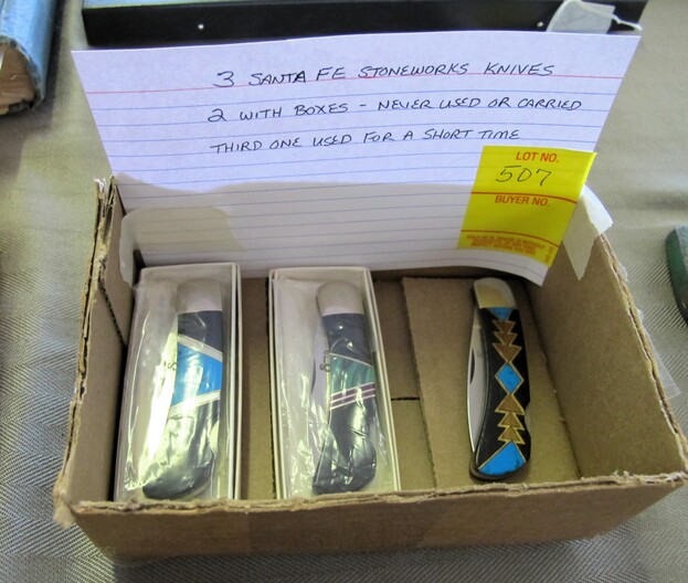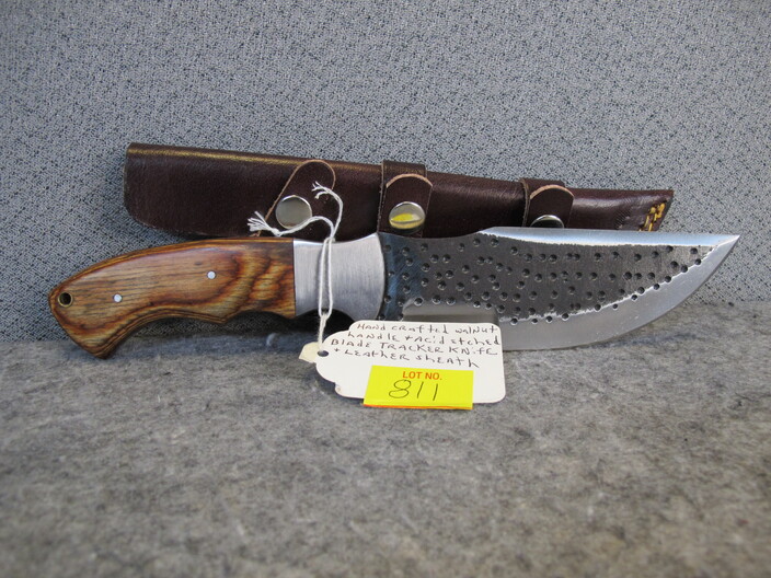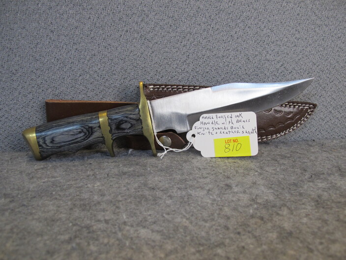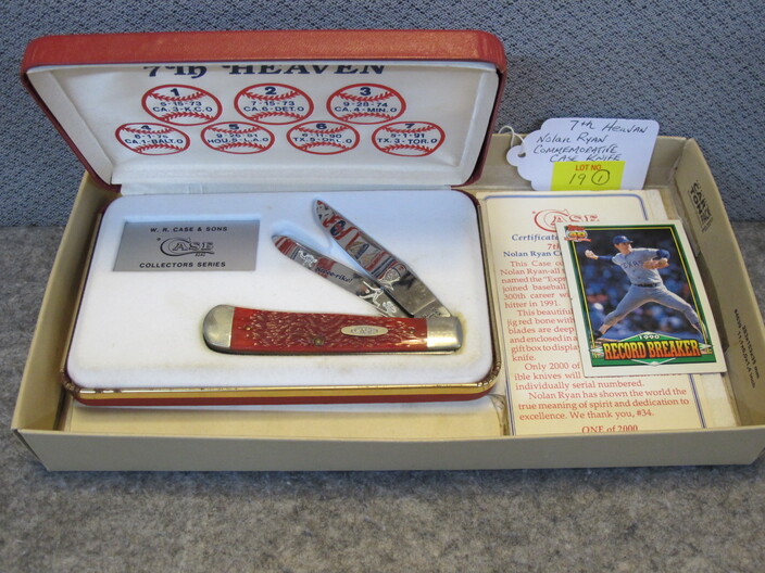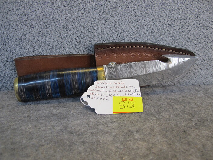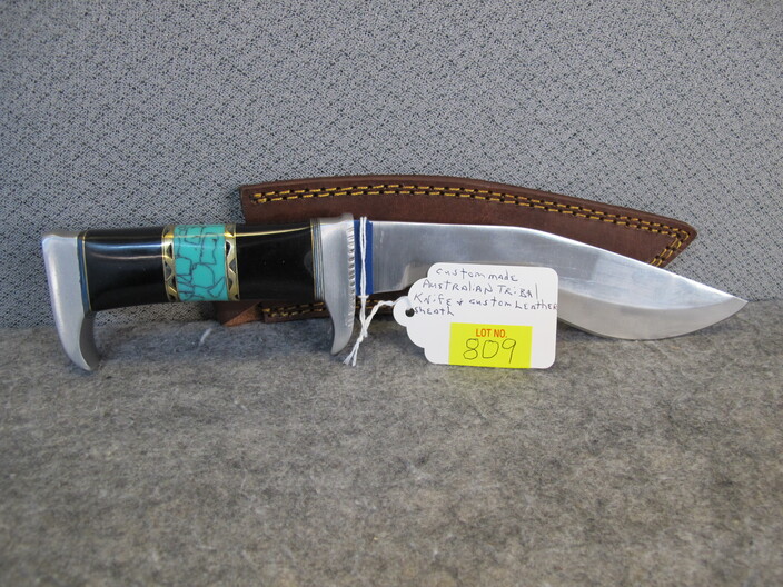 COLLECTIBLE KNIVES & RELATED: Custom Made Australian Tribal Bowie Knife w/ Custom Leather Sheath~Hand Forged Oak Handle Brass Finger Guards Bowie Knife w/ Handmade Leather Sheath~(3) Santa Fe Stoneworks Knives (2 w/ Boxes, Never Used, 3rd Used For Short Time)~Hand Crafted Walnut Handle Acid Etched Blade Tracker Knife w/ Custom Leather Sheath~Custom Made Damascus Blade Corian Sandstone Handle Skinner Knife & Custom Leather Sheath~Hand Forged Acid Etched Blade & Bone & Walnut Handle Belt Knife w/ Custom Leather Sheath~Nolan Ryan 1/2000 Case XX Knife In Original Case & 1990 Record Breaker Tops Card~Vintage German Hunting Knife w/ Stag Handle & Eagle Pommel w/ Original Sheath~D. H. Russell Grohmann Belt Knife In Original Box~