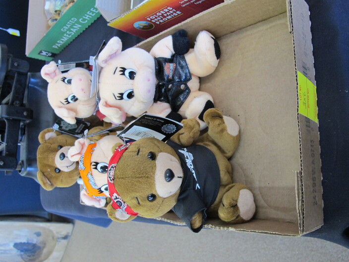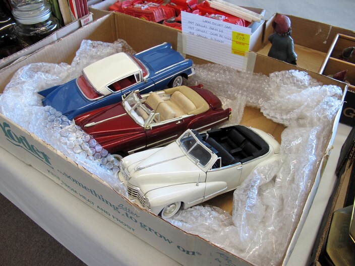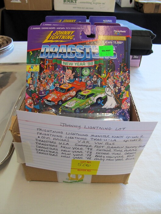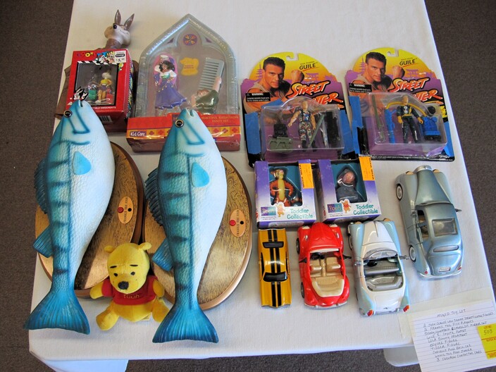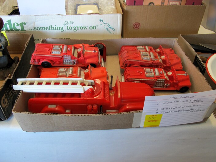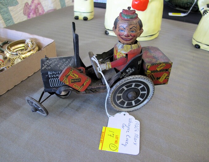 TOYS & RELATED: 1920’s Marx Whoopee Crazy Car~“Stack & Build” Framed Lincoln Log Advertisement~(8) Johnny Lightning Die Cast Cars To Include: Frightning Munster Koach Episode 2, Frightning Lightning Dragula Episode 2, .com Racers Y2K VW Bus, Dragsters USA Summer Fest Slamin’ Sammy Gold, Dragsters New Year ’98 Father Time Purple, Dragsters New Year ’98 Father Time Green, Dragsters New Year ’98 Baby New Year Red & Dragsters New Year ’98 Baby New Year Blue~Mixed Lot Of (14) Toys To Include: (2) Van Damme Street Fighter Figures, (2) Frankie The Fish, Hunchback Esmerelda Mirror Set, (3) Chevron Character Cars, Wile E. Coyote Puppet, Lola Bunny Ornament, Chevelle Pullback Car, Eeyore Figure, Tigger Figure, Winnie The Pooh Jingler~(1) Lot w/ Hot Wheels Blvd. Metal Sign & Hallmark Limited Hot Wheels Lunch Box Commemorative~(7) Danbury Mint Dolls~Like New Game Boards~Poker Game Lot~Harley Davidson Bean Bag Plush Animals~Vintage Doll Trunk & Doll Clothes~(3) Large Die Cast Cars To Include: 1947 Cadillac Series 62 Convertible, 1949 Cadillac Coupe De Ville & 1958 Cadillac El Dorado~Fire Truck Lot w/ (9) Items To Include: (1) My First Hot Wheels Juvenile Fire Truck, (7) Auburn Rubber/Plastic Fire Trucks & (1) Sanders Large Plastic Ladder Truck~Box Lot w/ Many Barbie Hallmark Ornaments~