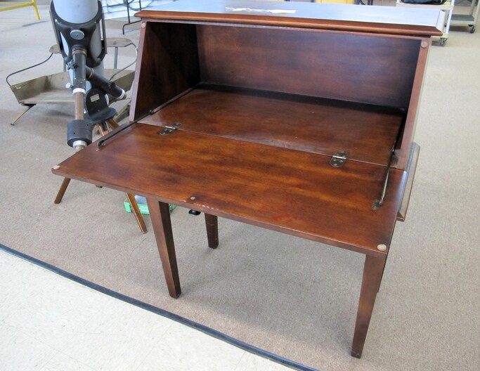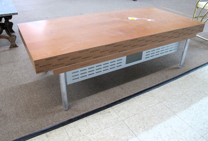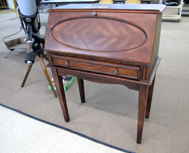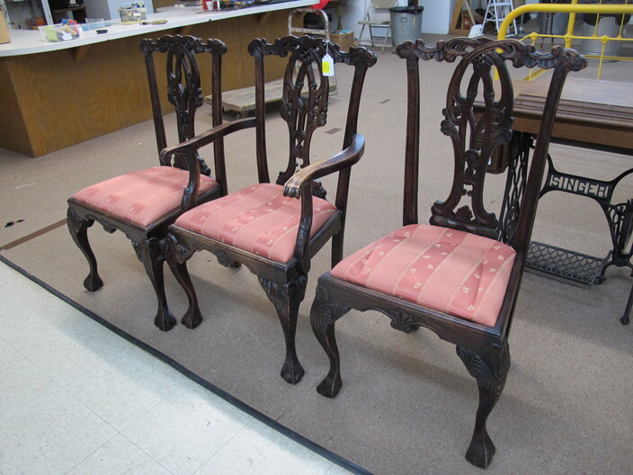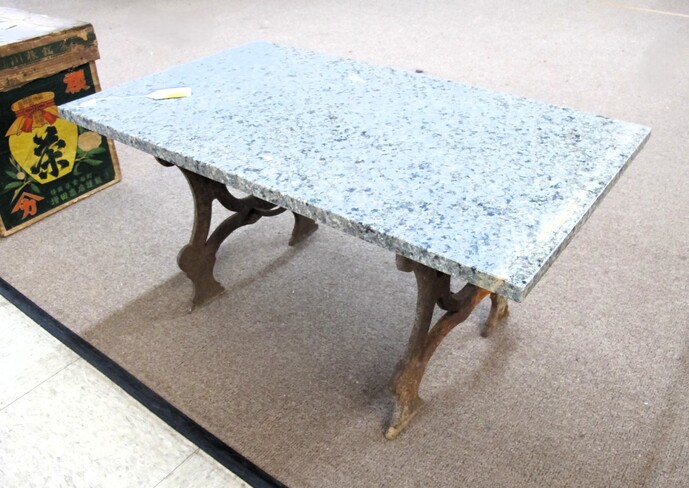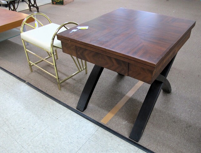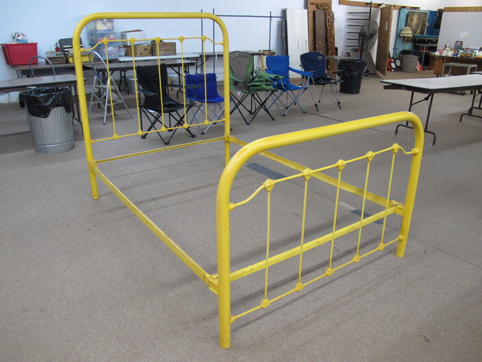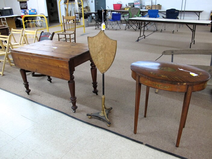 FURNITURE: Full Size Antique Iron Bed~Contemporary Drop Front Writing Desk~Edwardian Style Oval Occasional Table~Vintage Pine Farm House Table~Vintage Folding Rocker~(3) Chippendale Style Dining Chairs~Wooden Lamp Table w/ “X” Shaped Legs~Vintage Hollywood Regency Style Rosalco Brass Plated Vanity Bench~Cherry Coffee Table Made In Italy~Marble Top Table On Cast Iron Base~Antique Shield Shape Fire Pole Screen w/ Damage~Antique Oak Frame House Dining Chair~Maitand-Smith Piazza San Marco Side Chairs (To Be Recovered)~(5) Folding Camping Chairs~Set Of (4) Folding Wooden Chairs~